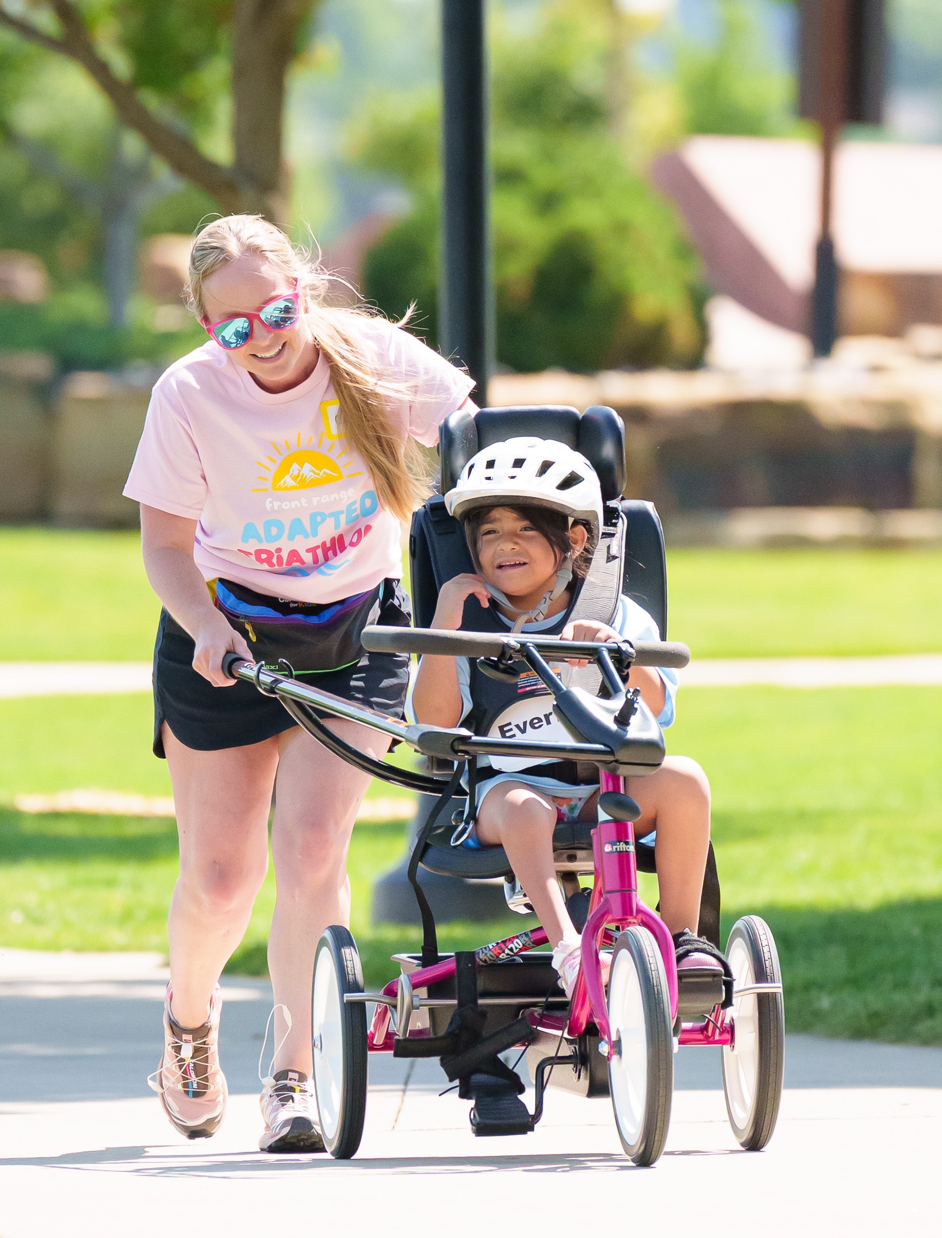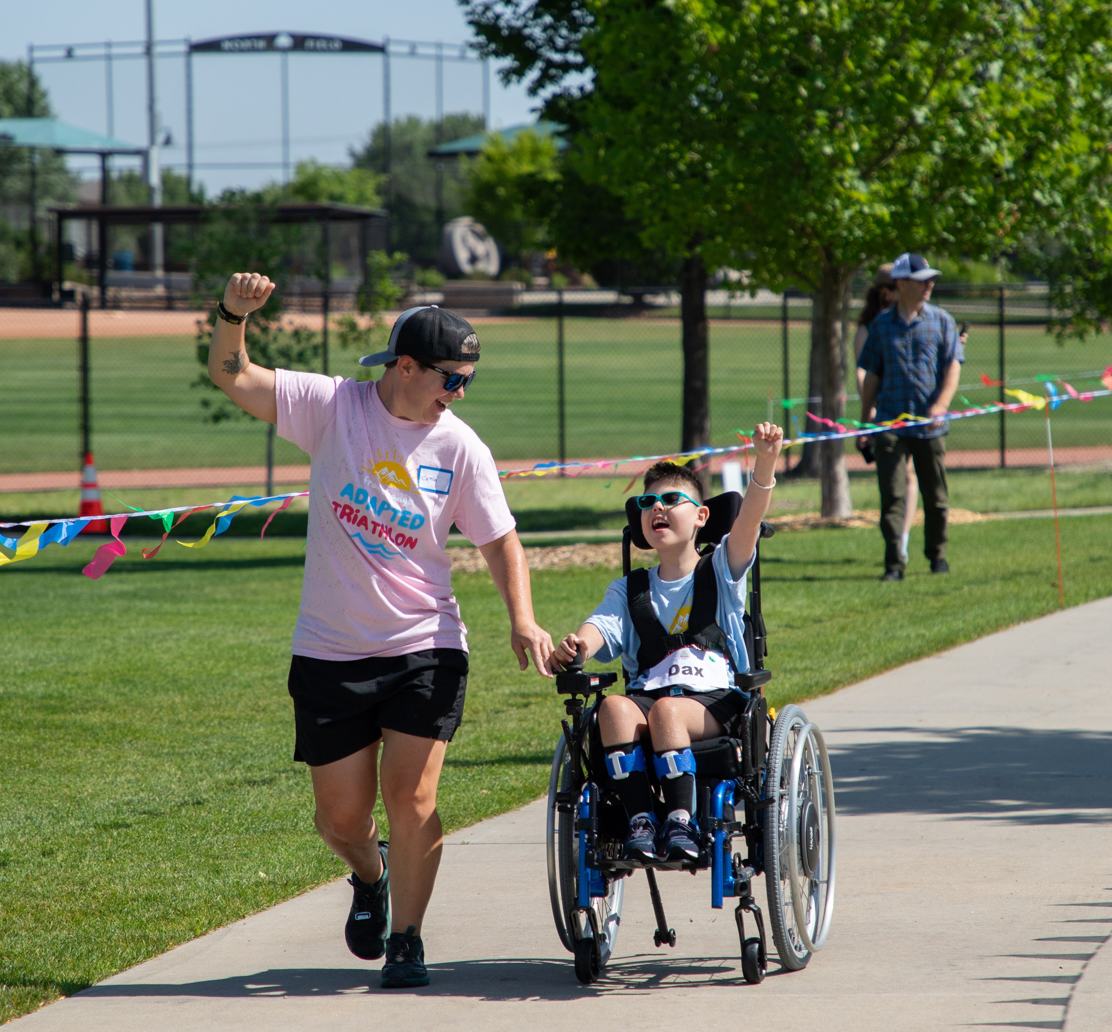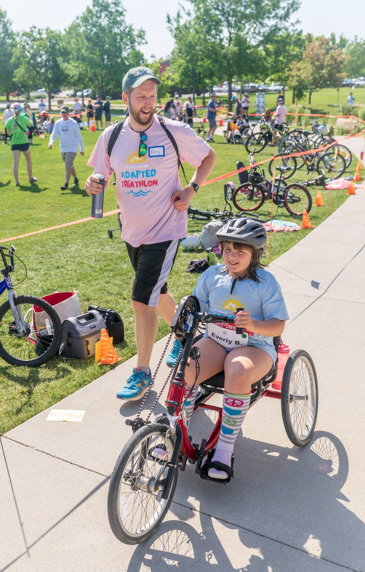 The adapted triathlon will consist of swim, bike, and run/walk/roll/push portions. We aim to meet each athlete where they are at functionally with adapted equipment (bikes, flotation devices, etc.) and as much or little support that they may need throughout the race. Anything can be modified depending on athlete needs!